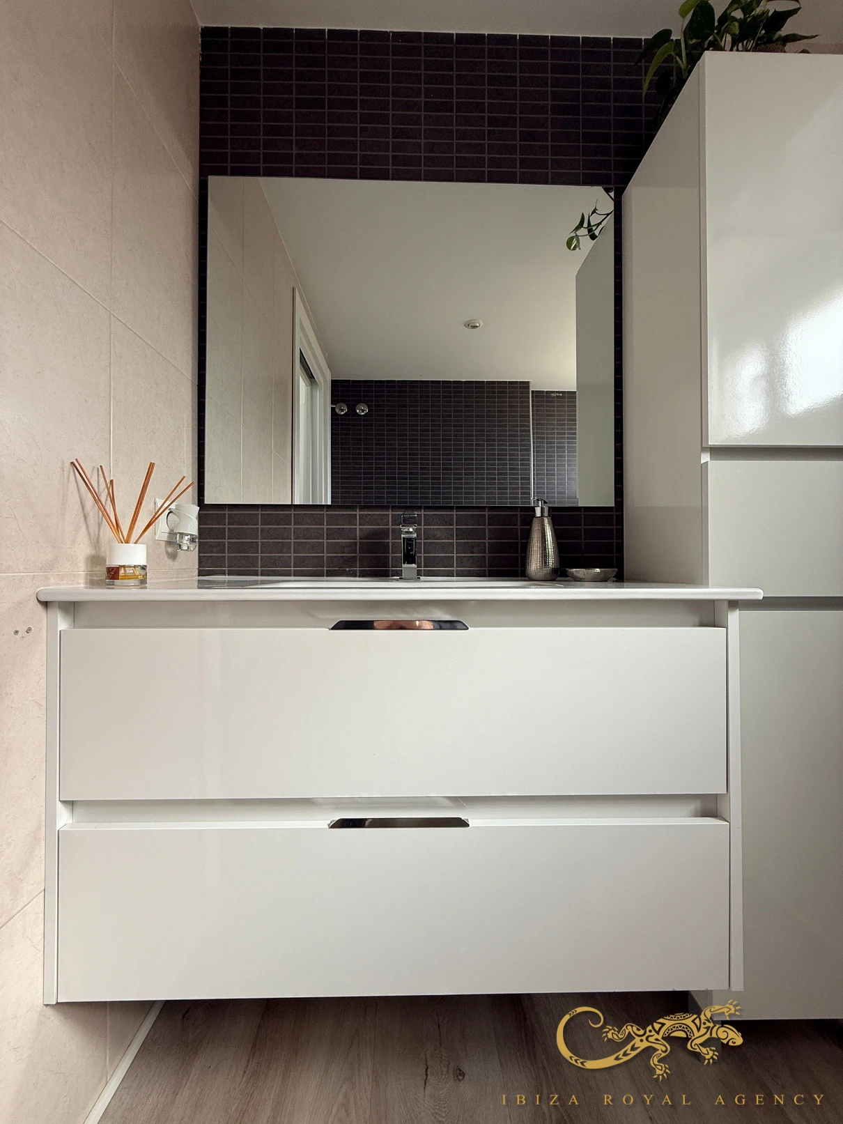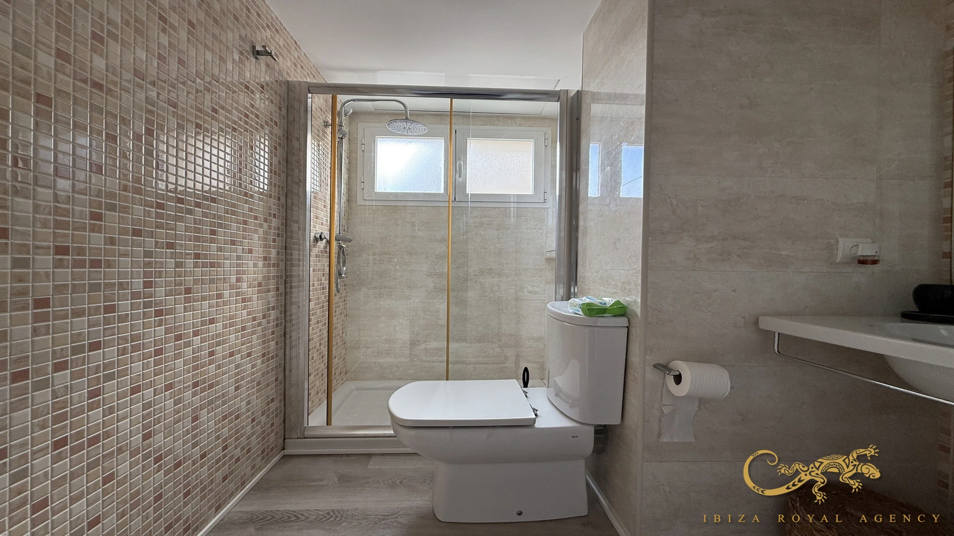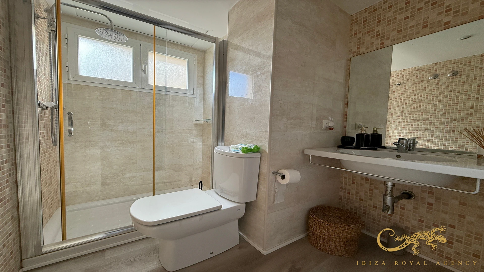 IBIZA ROYAL AGENCY bietet eine exklusive Dachgeschosswohnung mit 123 m² in der Gegend von Cas Serres, Ibiza, zur Miete für die Sommersaison mit einem Mindestmietvertrag von 6 Monaten an. Diese Wohnung zeichnet sich durch ihr modernes Design, ihre Helligkeit und ihre Lage in einer ruhigen Umgebung aus.