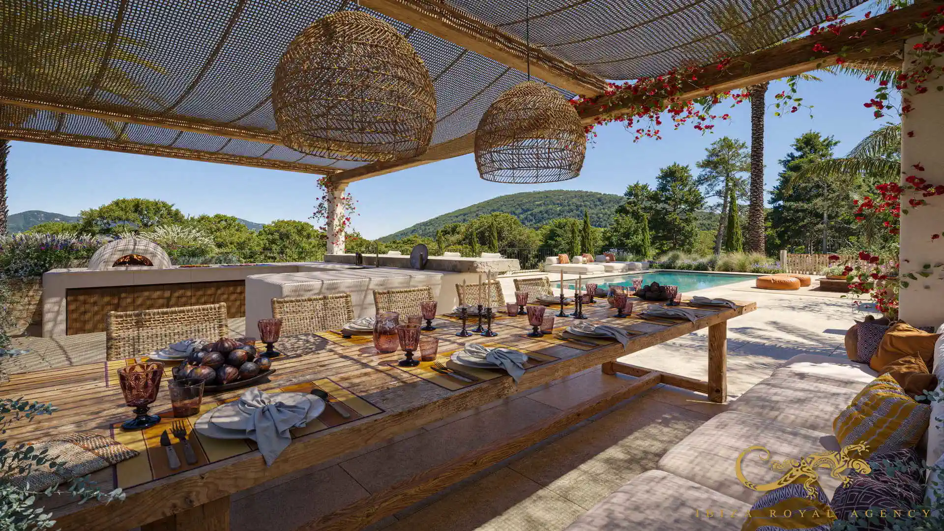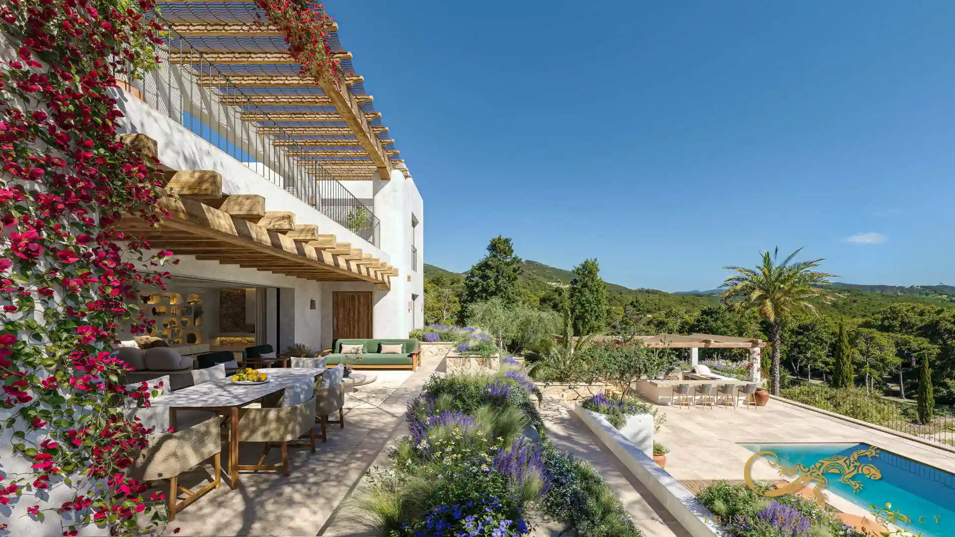 Der Außenbereich ist eine wahre Oase: Infinity-Pool als Herz des Gartens, umgeben von Palmen und mediterraner Bepflanzung. Mehrere Lounge-Zonen laden zum Sonnenbaden oder zum Cocktail bei Sonnenuntergang ein; Außenküche mit Pergola perfekt für lange Sommerabende mit Familie oder Freunden. Intime Plätze zum Entspannen, zur Ruhe zu kommen oder einfach den Moment zu genießen.
