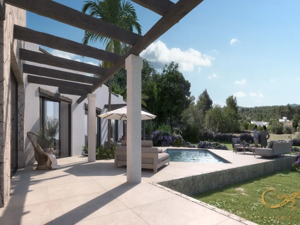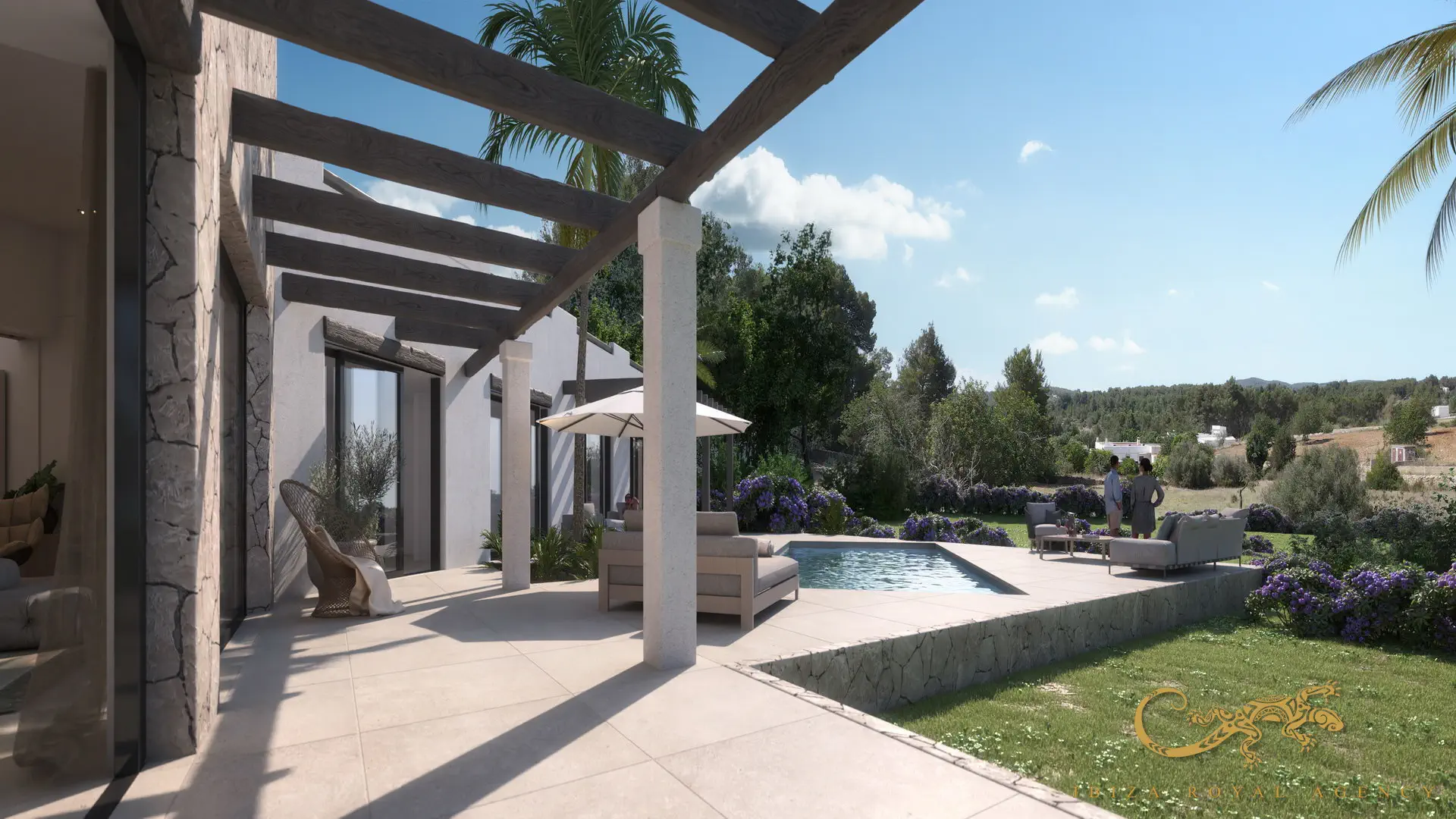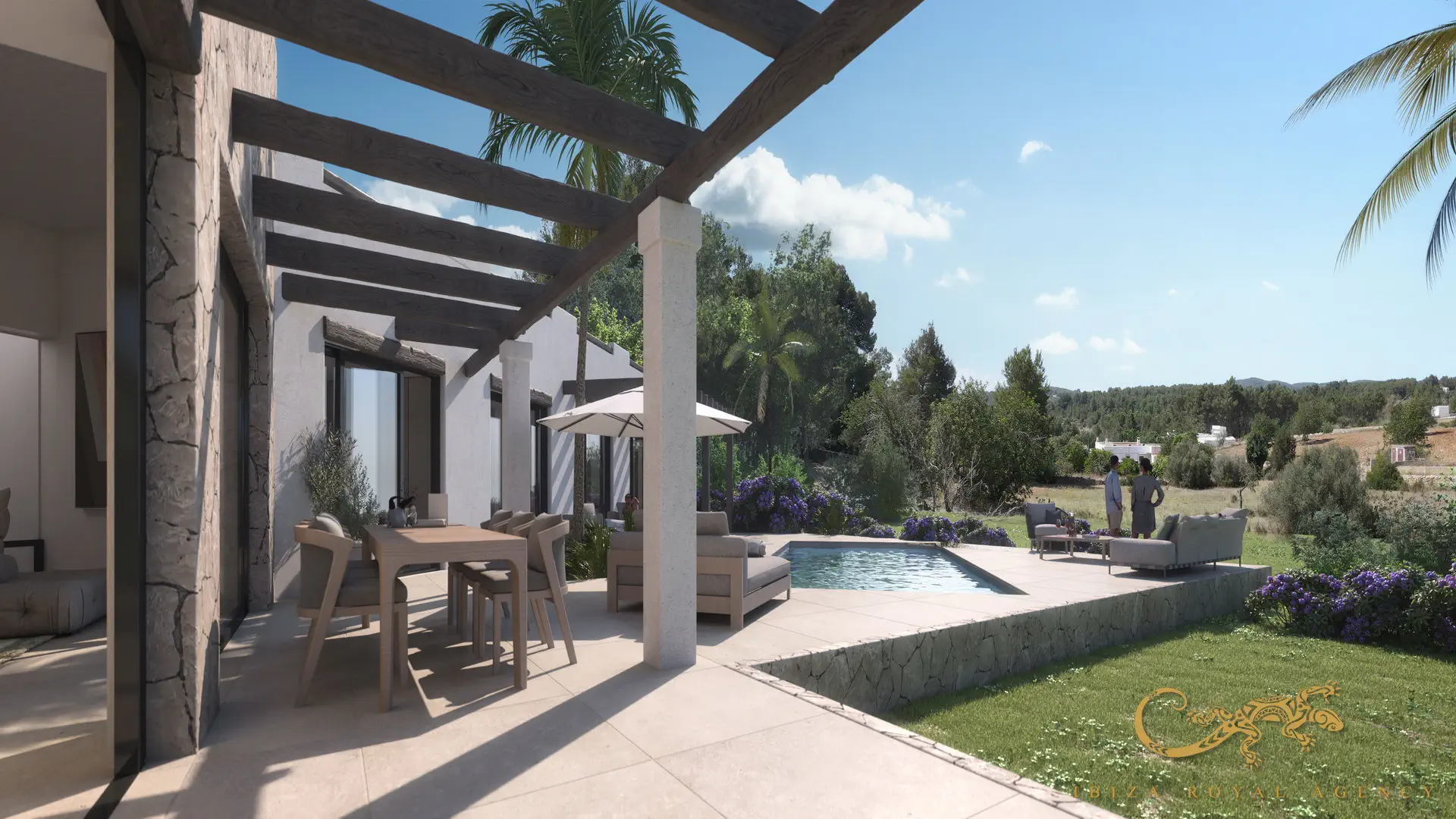 Die Außenbereiche wurden für minimalen Wartungsaufwand gestaltet, mit der Möglichkeit, ein zusätzliches 30 m² großes Gästehaus zu bauen. Das Anwesen verfügt außerdem über einen eigenen Brunnen sowie zwei originale ibizenkische Strukturen im Innenhof, die den Charme der Umgebung unterstreichen.
