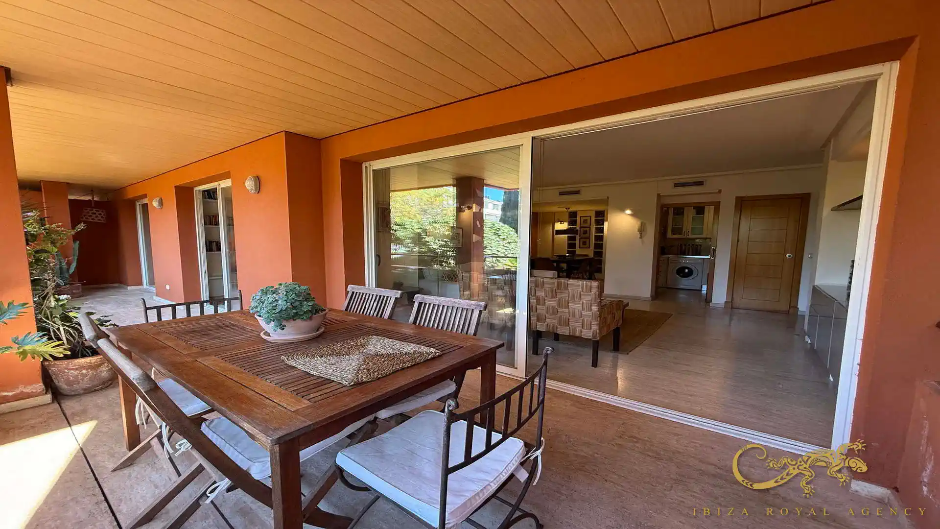 Der großzügige Wohn- und Essbereich bildet das Herzstück der Immobilie. Von hier aus gelangt man direkt auf die private Terrasse, die zum Entspannen und Genießen des mediterranen Klimas einlädt. Dieser Außenbereich eignet sich perfekt für Frühstück im Freien, entspannte Abende oder gesellige Momente. Der fließende Übergang zwischen Innen- und Außenbereich verstärkt das Gefühl von Raum und Komfort.