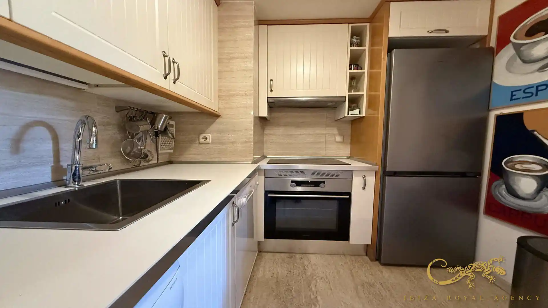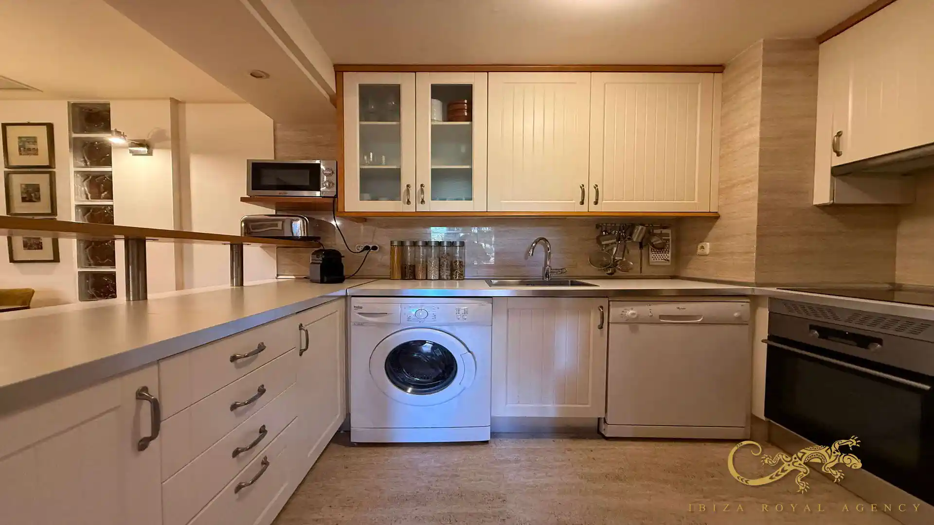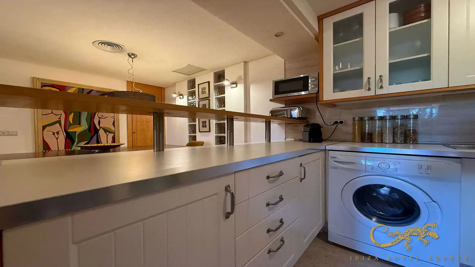 Die voll ausgestattete offene Küche mit Frühstücksbar fügt sich harmonisch in den Wohnbereich ein. Sie bietet moderne Elektrogeräte, ausreichend Stauraum und alles, was für einen komfortablen Aufenthalt über mehrere Monate erforderlich ist. Das offene Design sorgt für eine moderne und funktionale Wohnatmosphäre.