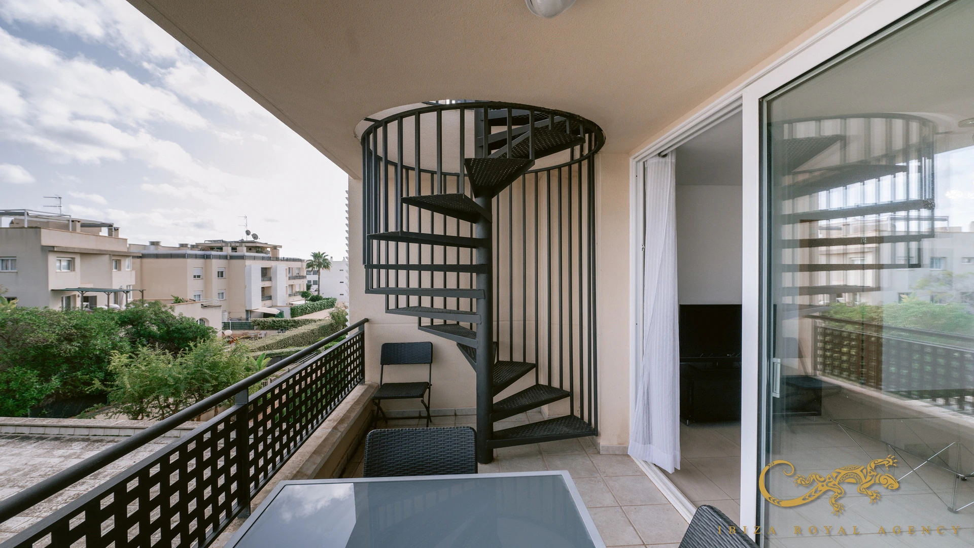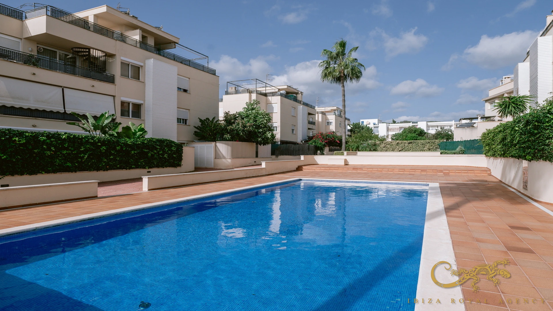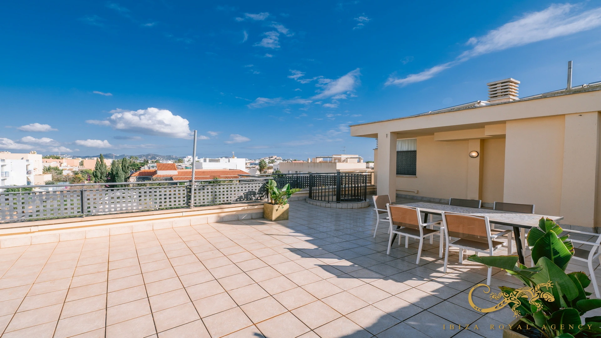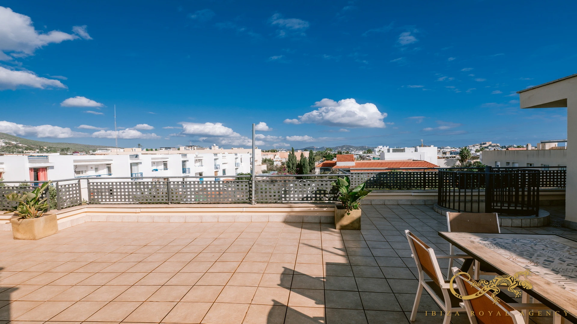 Das wahre Highlight dieser Immobilie ist die beeindruckende private Dachterrasse. Mit 90 m² bietet sie einen Panoramablick auf die Stadt Ibiza, das ikonische Dalt Vila und die umliegenden Hügel. Dieser Raum eignet sich perfekt für ein Abendessen im Freien, zum Sonnenbaden oder einfach, um Momente der Ruhe zu genießen. Außerdem gibt es im Komplex einen Gemeinschaftspool, der von sorgfältig gestalteten Gärten mit Palmen umgeben ist – ein Oasis, um an den heißeren Tagen zu entspannen.