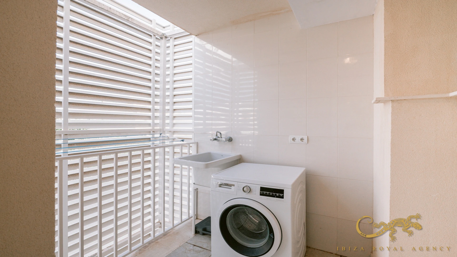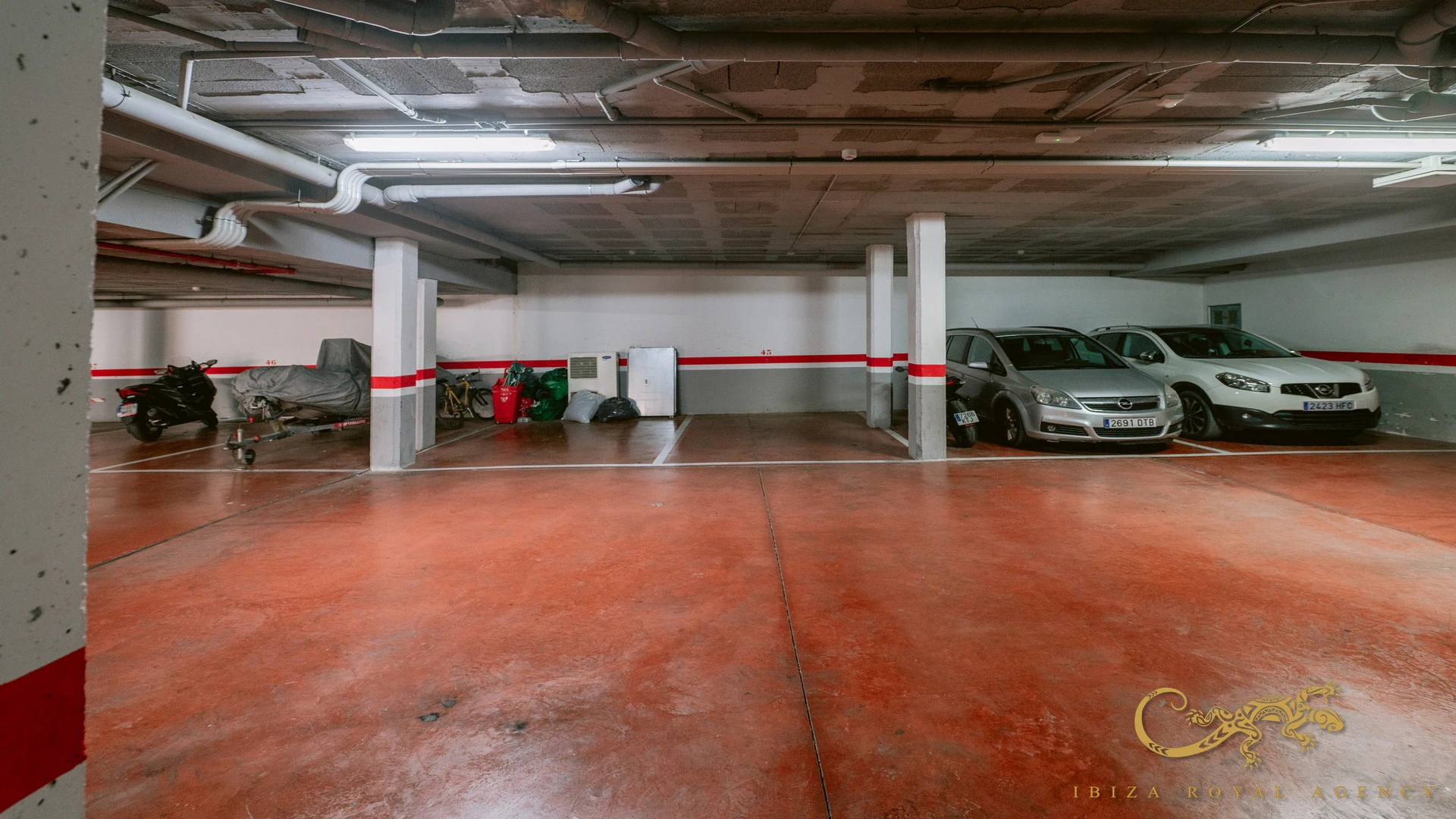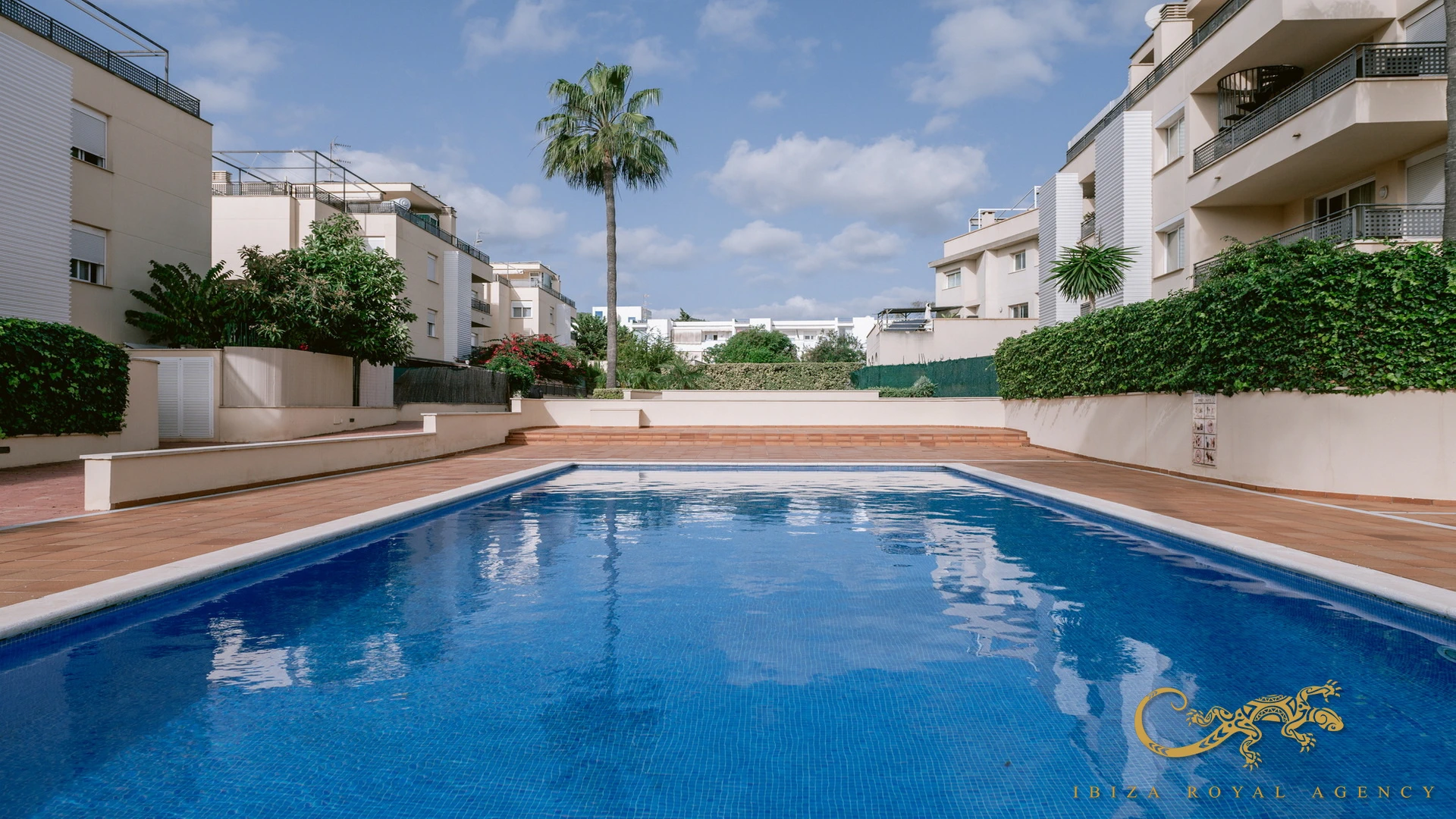 Das wahre Highlight dieser Immobilie ist die beeindruckende private Dachterrasse. Mit 90 m² bietet sie einen Panoramablick auf die Stadt Ibiza, das ikonische Dalt Vila und die umliegenden Hügel. Dieser Raum eignet sich perfekt für ein Abendessen im Freien, zum Sonnenbaden oder einfach, um Momente der Ruhe zu genießen. Außerdem gibt es im Komplex einen Gemeinschaftspool, der von sorgfältig gestalteten Gärten mit Palmen umgeben ist – ein Oasis, um an den heißeren Tagen zu entspannen.